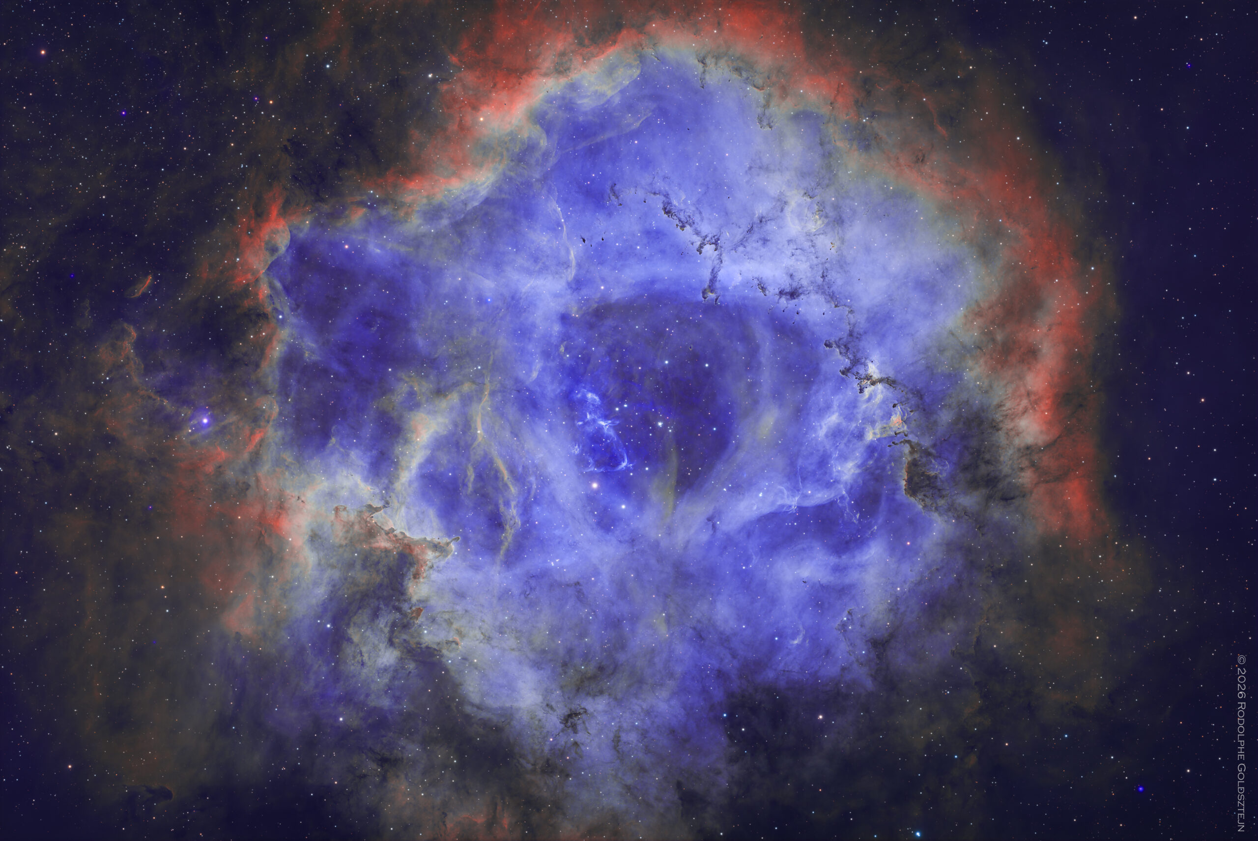 La nébuleuse de la “Rosette” (Sh 2-173), ici photographiée en bande étroite SHO, est une cible populaire de la constellation de la Licorne.