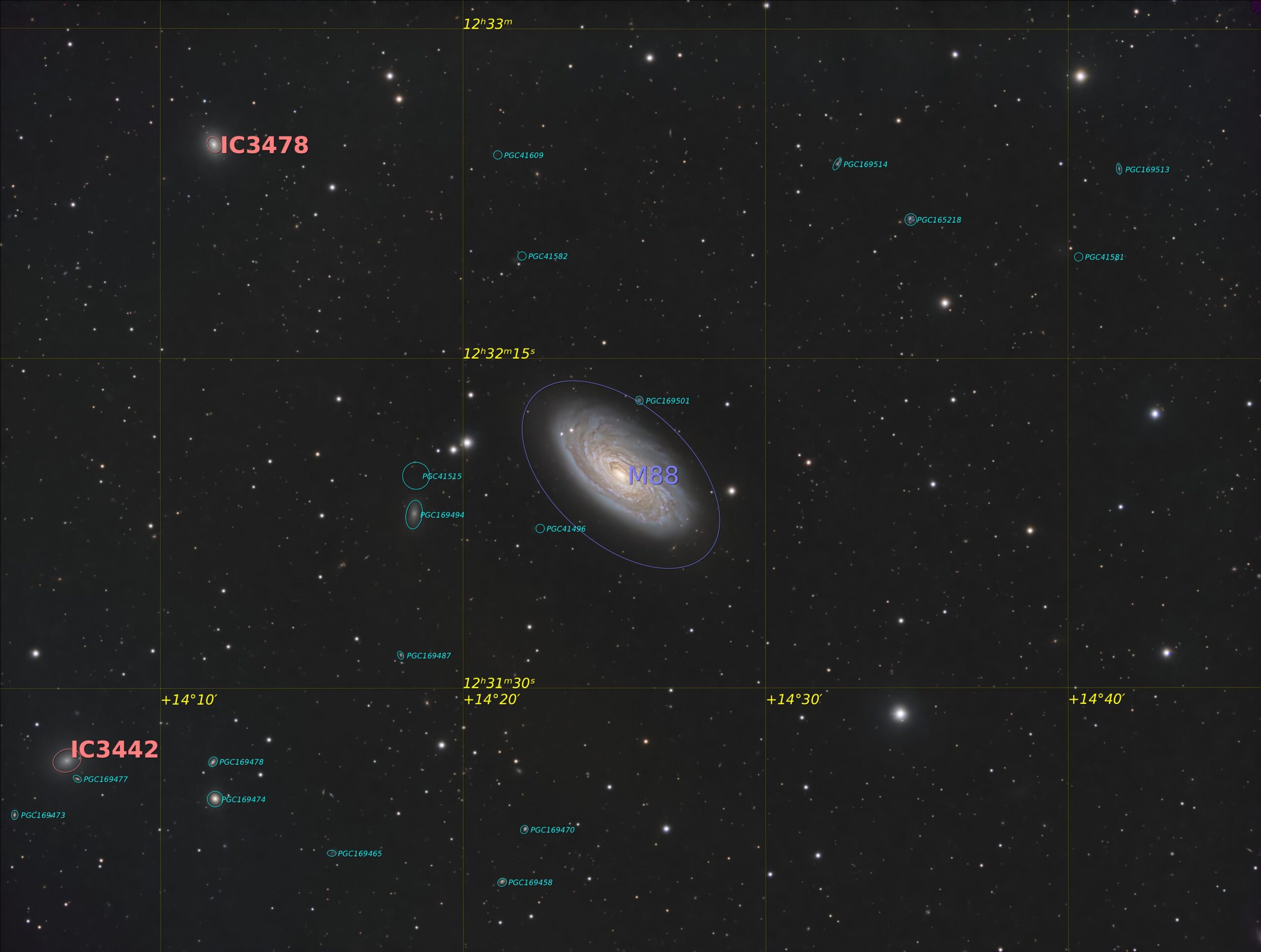 M 88 n’est pas souvent photographiée, pourtant je lui trouve une belle allure avec son centre très lumineux, donc très actif. Son trou noir central est super-massif, estimé à 100’000 fois la masse du Soleil – pas très envie d’y tomber dedans. Sa taille angulaire d’un peu moins de 7 minutes d’arc la réserve à des instruments d’une belle longueur focale pour pouvoir en saisir quelques détails.