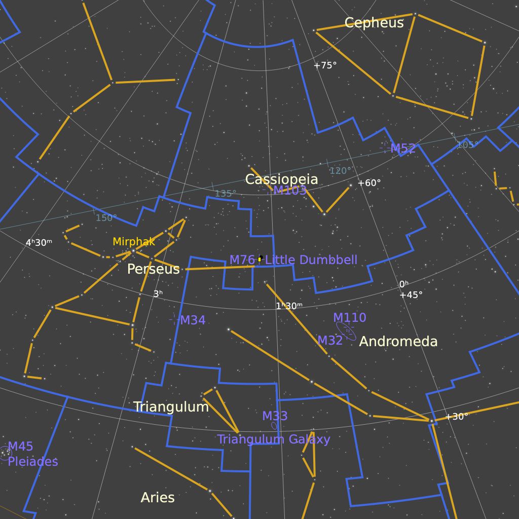 M 76, ou “Little Dumbbell” dans la constellation Persée est située à une distance mal connue estimée entre 3’000 et 4’500 années-lumière. Elle est franchement très petite, 3.1 minutes d’arc, et très pâle également, ce qui en fait une cible aussi bien difficile en observation directe qu’en astrophotgraphie.